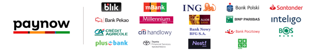 Za pośrednictwem paynow dokonać płatności bezpośrednio przez stronę wybranego banku, w tym korzystając z funkcjonalności „Blik”.